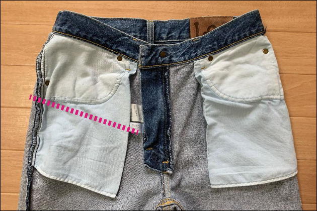 まず履き古したパンツを用意。そしてポケットの袋となっている部分を除去します。これを行うことでダイレクトにペニスを握ることが可能になります。私の場合は、履いて右側になるポケットを切り取ります。