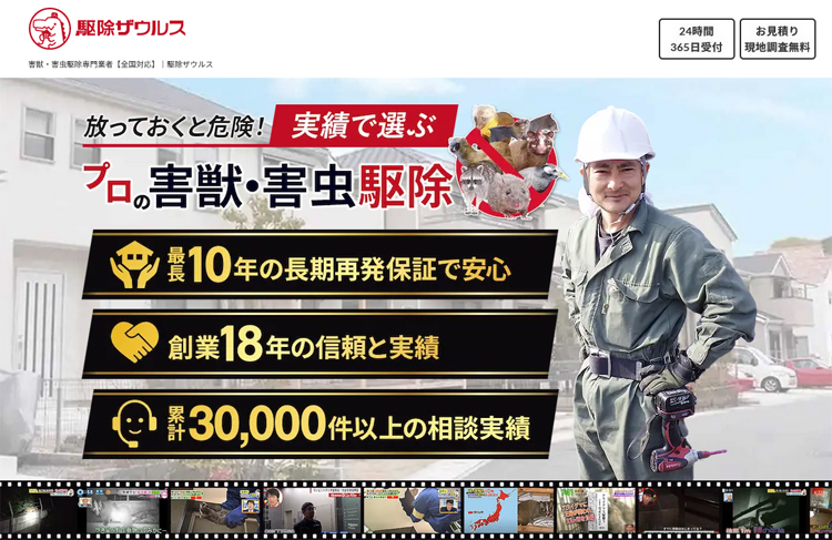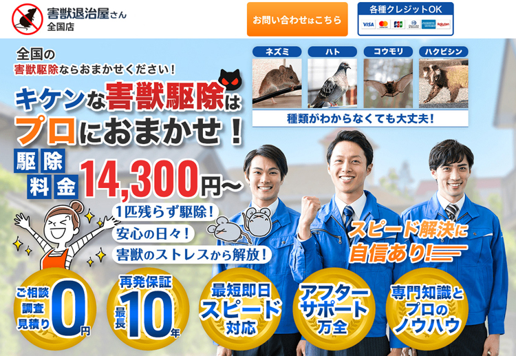 全国展開で害獣の駆除をしてくれる「害獣退治屋さん」。最近のネズミ被害について警鐘を鳴らしており、最長10年の保証も人気です。