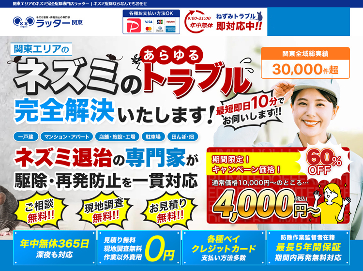 関東圏に限りますが「ラッター」も非常に優秀なネズミ駆除業者。期間限定のキャンペーンを展開している事も多く、安価でネズミ駆除ができる業者として有名です。